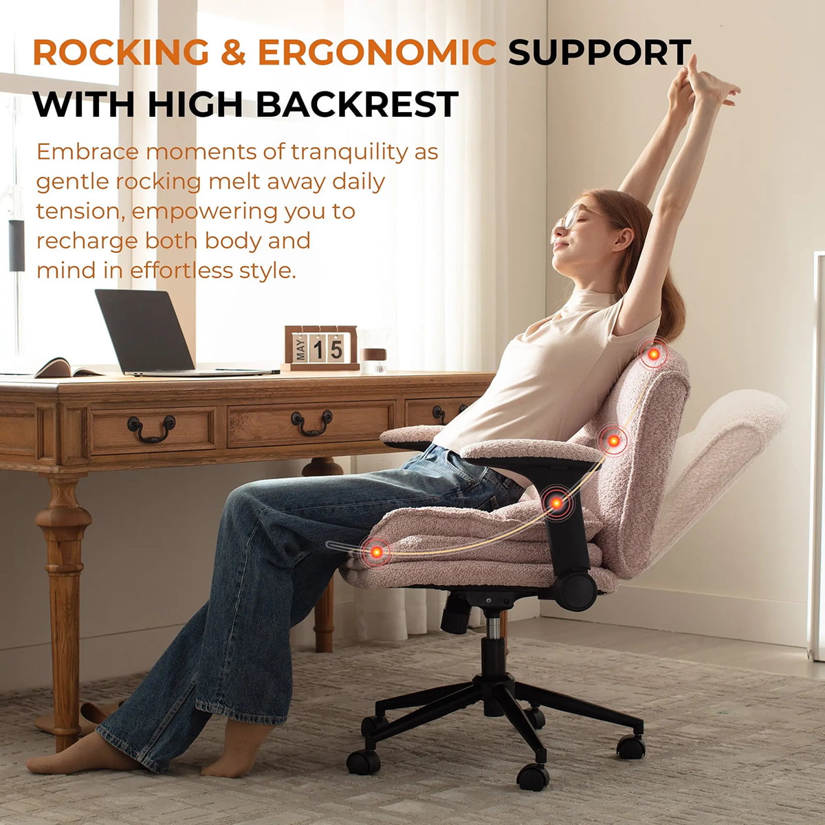 Динамическая поясничная подушка безопасности адаптируется к движениям вашего тела, обеспечивая надлежащую поддержку позвоночника во время долгих часов работы, учебы, игр или макияжа. Плавное вращение на 360°, регулировка высоты на 2,8 дюйма, раскачивание на 90–120° и бесшумные ролики позволяют легко перемещаться в течение дня.