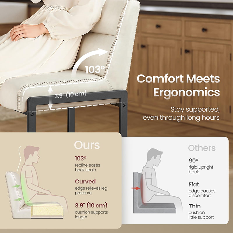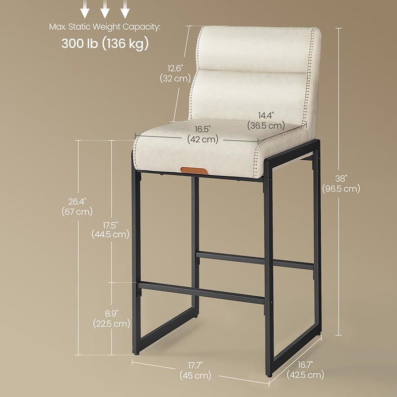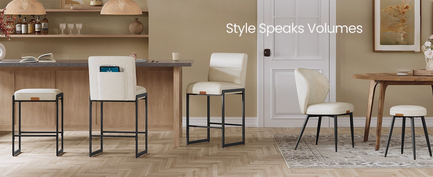 Современные барные стулья середины века, предназначенные для кухонных стоек и обеденных островов, эти кремово-белые стулья со стойкой имеют прочную обивку из искусственной кожи с изысканной строчкой и чистый архитектурный металлический каркас. Эргономичная сегментированная спинка с углом наклона 103 градуса, мягкое сиденье толщиной 3,9 дюйма и изогнутый передний край обеспечивают длительный комфорт при длительном сидении, что делает их подходящими как для жилых кухонь, так и для небольших коммерческих помещений, таких как кафе или выставочные залы.
