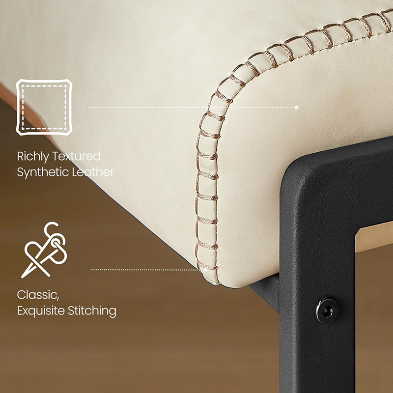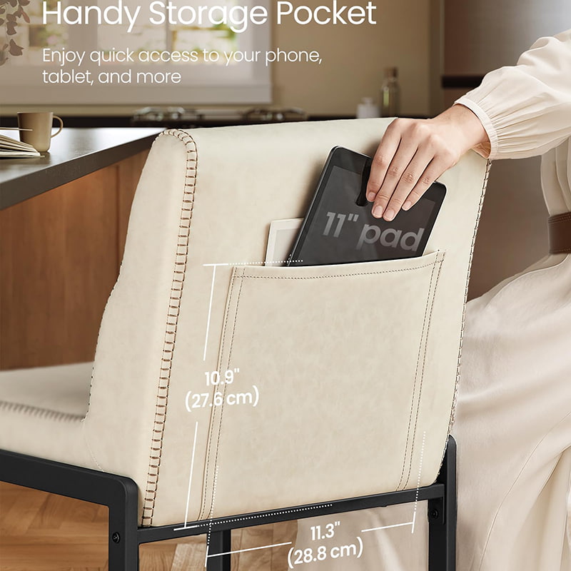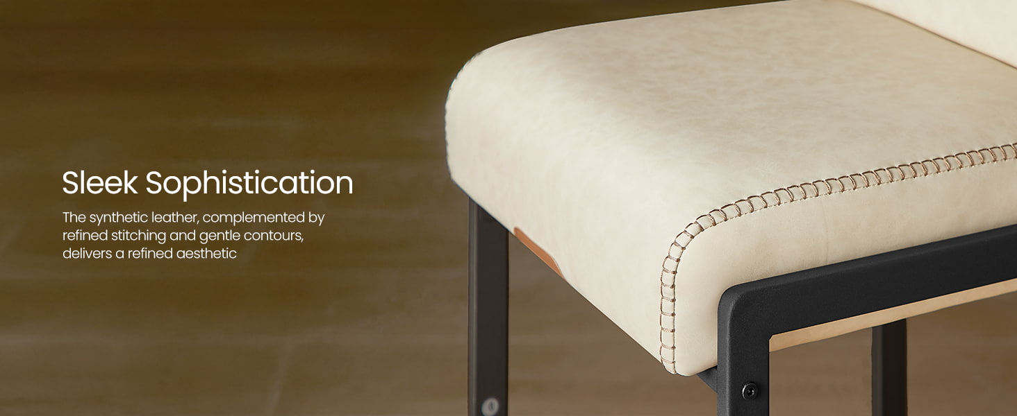 Гладкая поверхность из синтетической кожи украшена тонкой строчкой, что придает ей изысканный вид, но при этом за ней легко ухаживать — идеально подходит для загруженного домашнего хозяйства и небольших коммерческих помещений. Слегка изогнутый край сиденья помогает снизить давление на ноги, а встроенный задний карман обеспечивает удобное хранение телефонов, планшетов или мелких предметов первой необходимости. Этот барный стул, опирающийся на прочный металлический каркас со скрытыми регулируемыми ножками, обеспечивает устойчивость на различных поверхностях пола и легко адаптируется к современным кухням, столовым или просто развлекательным зонам.