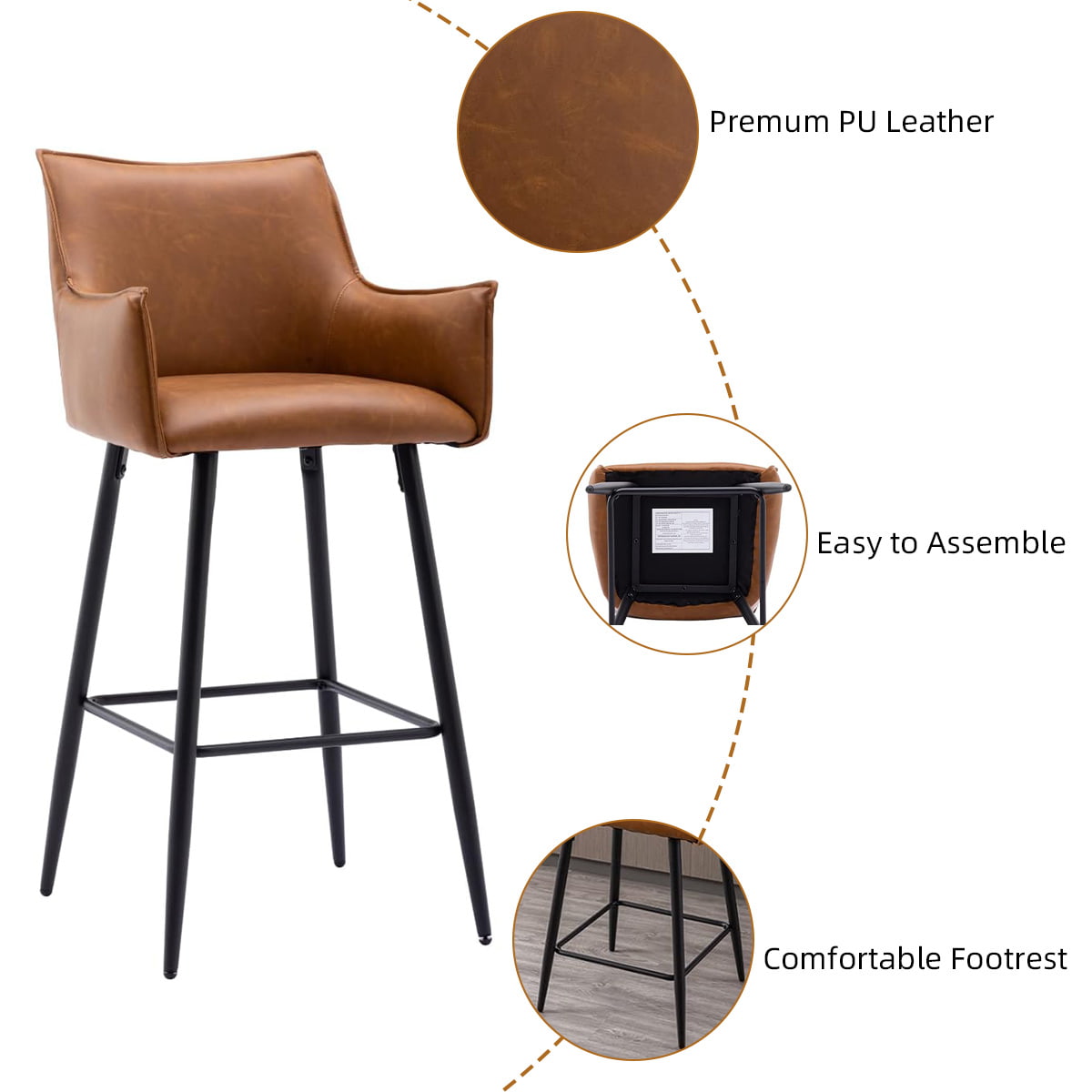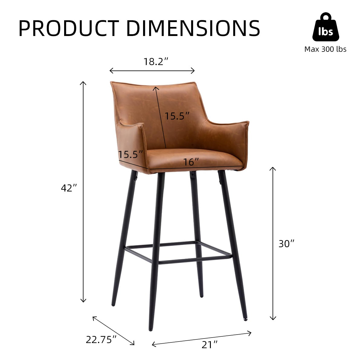 Современный коричневый барный стул из искусственной кожи с подлокотниками и спинкой — барный стул с мягкой обивкой встречной высоты и черными металлическими ножками для кухонного острова, бистро или домашнего бара