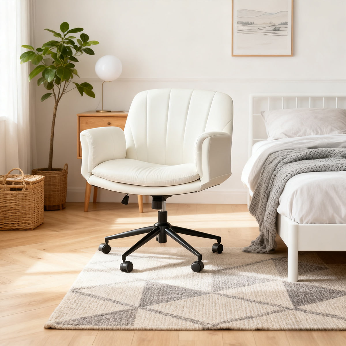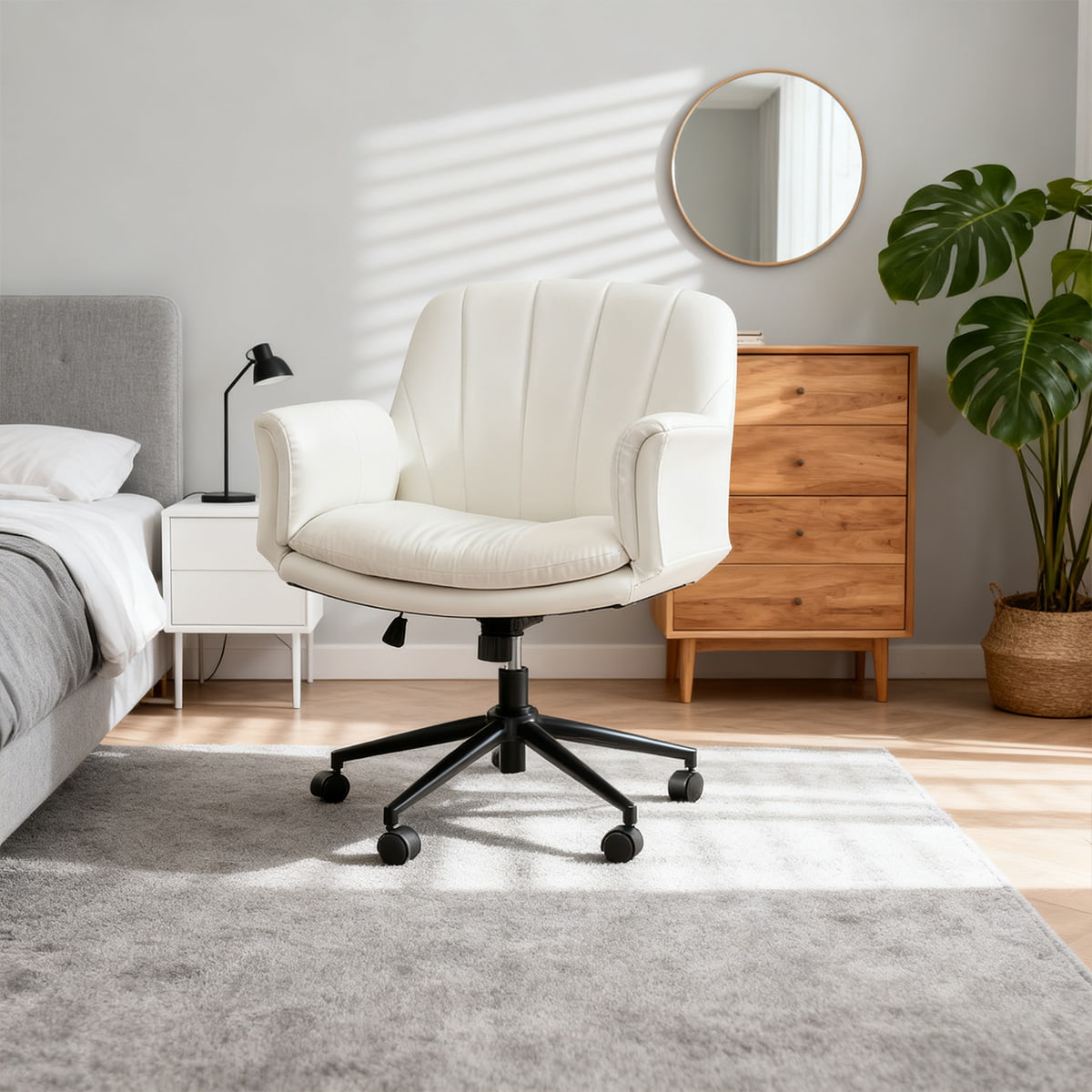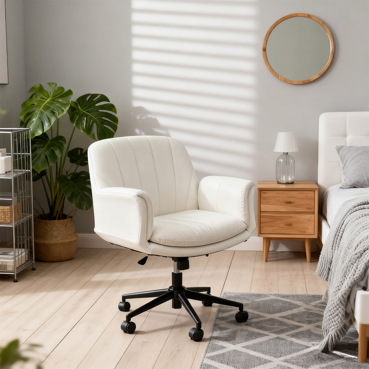 Регулируемое вращающееся кресло из искусственной кожи крест-накрест с 5-ступенчатыми подлокотниками и колесами — эргономичное кресло для туалетного столика/офиса/кресло для макияжа (молочно-белый)