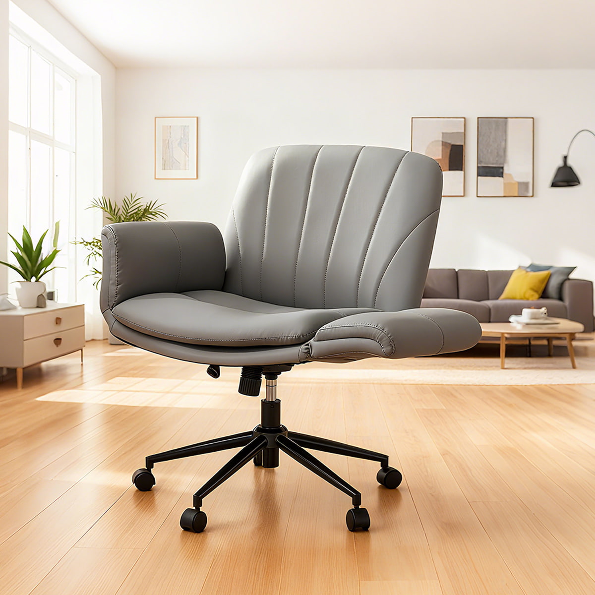 Кресло легко скользит с помощью бесшумных колес на 360°, оснащено подъемником высотой 3,54 дюйма и уникальным режимом качания CloudSway на 30°, идеально подходящим для медитации и релаксации. Идеально подходит для туалетных столиков, домашнего офиса, спален и современных рабочих пространств.